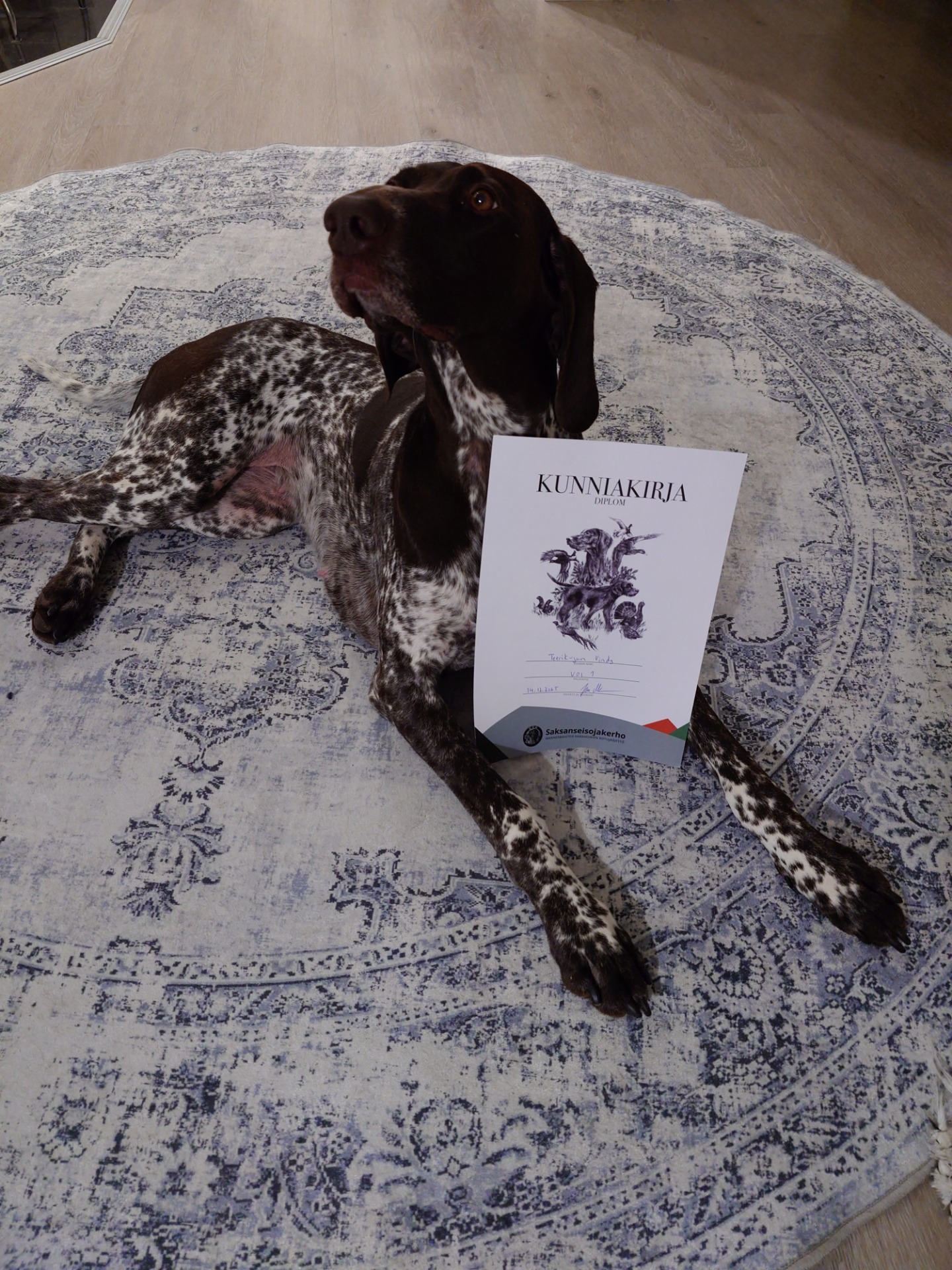 Pitkään siinä meni, käytännössä kaksi syksyä hakattu Vindin kans päätä tervaskantoon, aina jäänyt pienestä kiinni. Nyt on kuitenkin pääsylippu Riistakoiraan taskussa ja otettiin pienet konjakit sen kunniaksi.